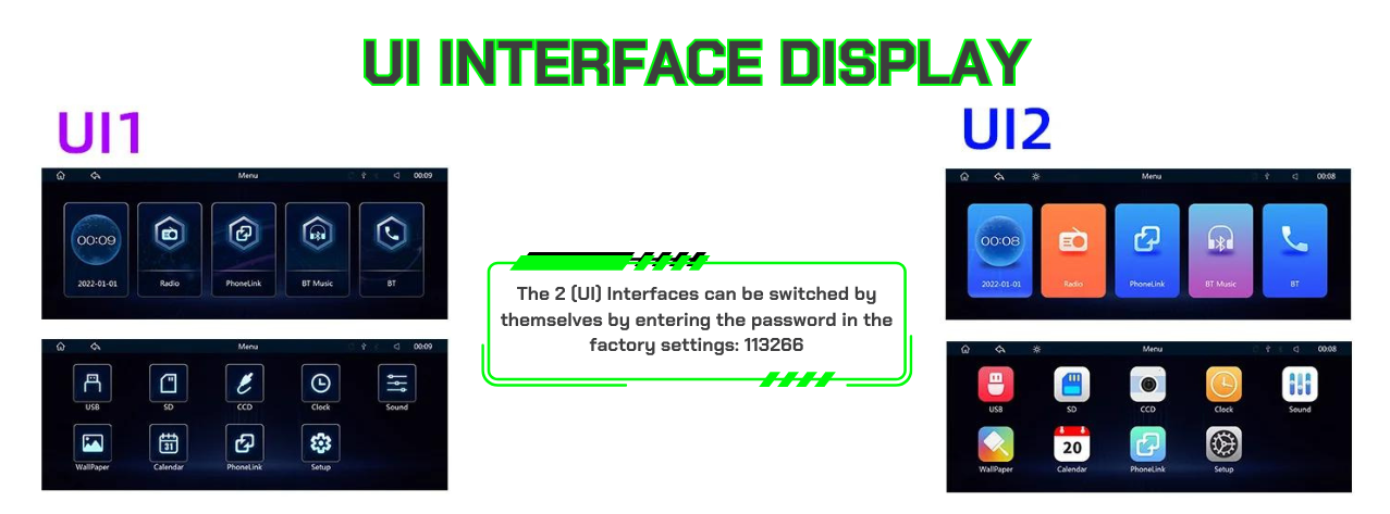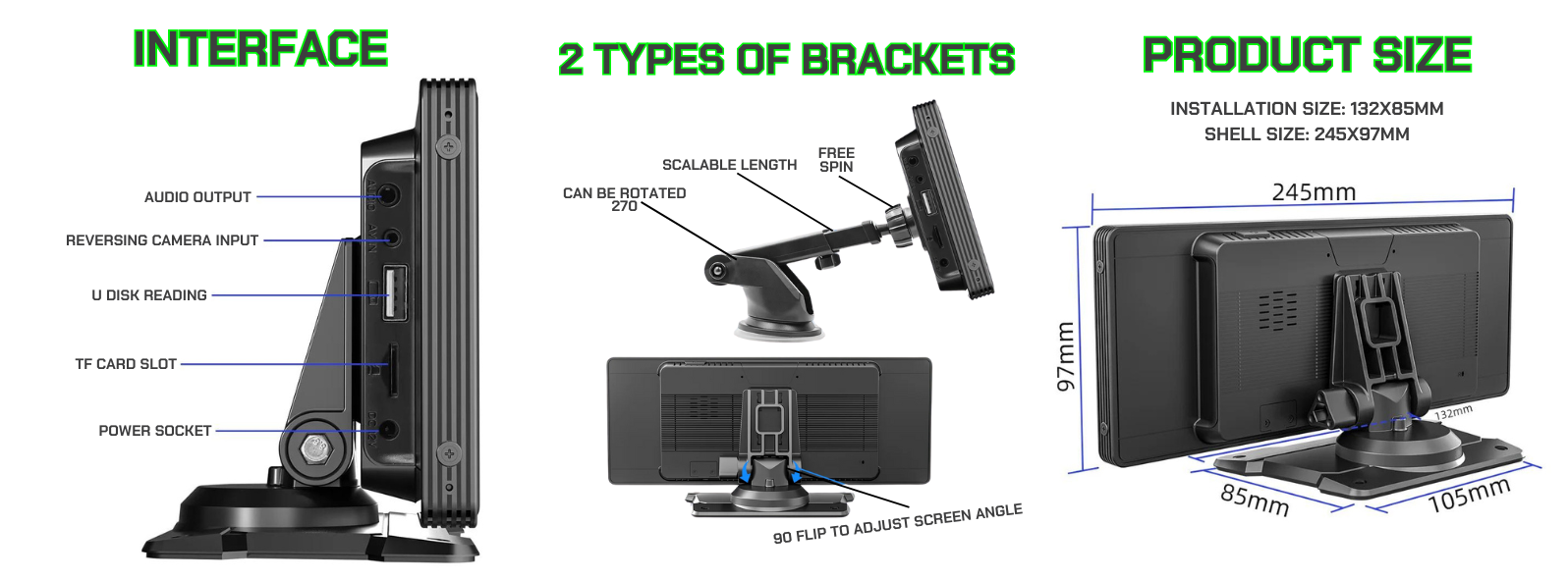 • BASIC FUNCTIONS: 1. Radio Frequency Transmission Function 2. USB Flash Drive SD Card (Audio/Video/Pictures) 3. Bluetooth Function 4. Wired Mobile-Phone Projection Screen, Wired and Wireless Apple CarPlay | Android Auto